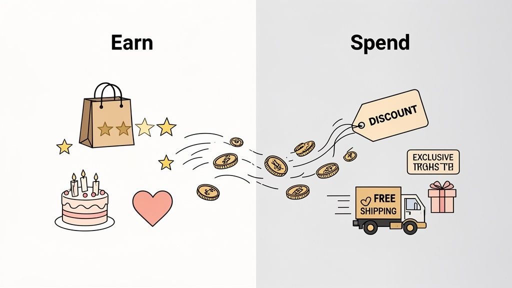 The best way to understand a points and rewards system is to think of it as a value exchange—a structured conversation between you and your customers. It's not about mindlessly handing out discounts. Instead, every action a customer takes is met with a tangible thank you. This whole dynamic rests on two simple ideas that create a powerful loop: how customers earn points and how they burn (or spend) them.