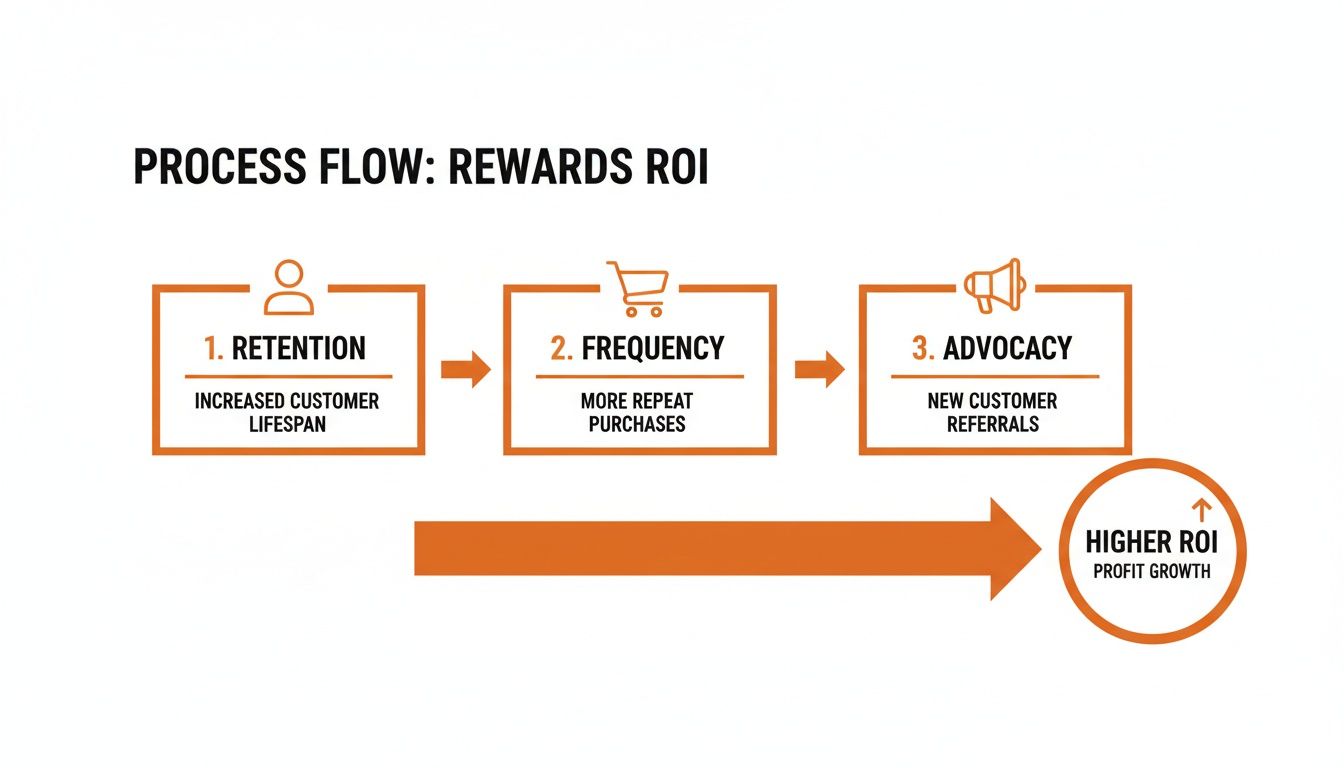 This flow chart breaks down how rewards directly fuel your ROI. It's a clear path from customer engagement to real business growth through retention, repeat purchases, and turning happy customers into your best marketers.